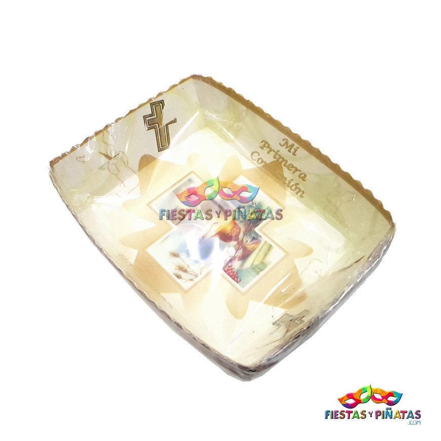 Bandeja para ponqué temática decoración Primera comunión dorado, ideal para alimentos – torta.