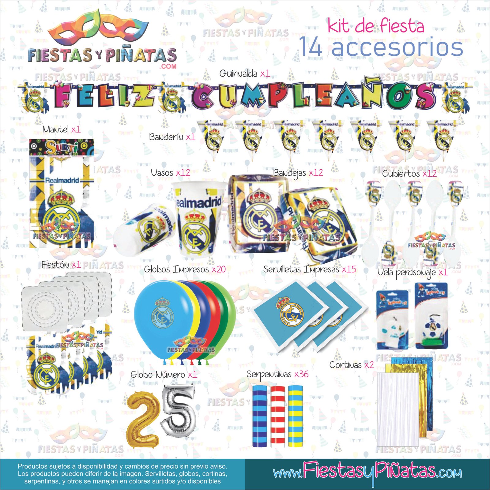 KIT CUMPLEAÑOS DECORACIÓN FUTBÓL REAL MADRID PARA FIESTAS 14 ACCESORIOS