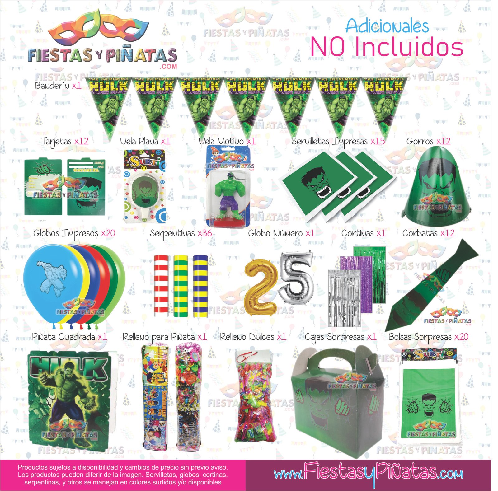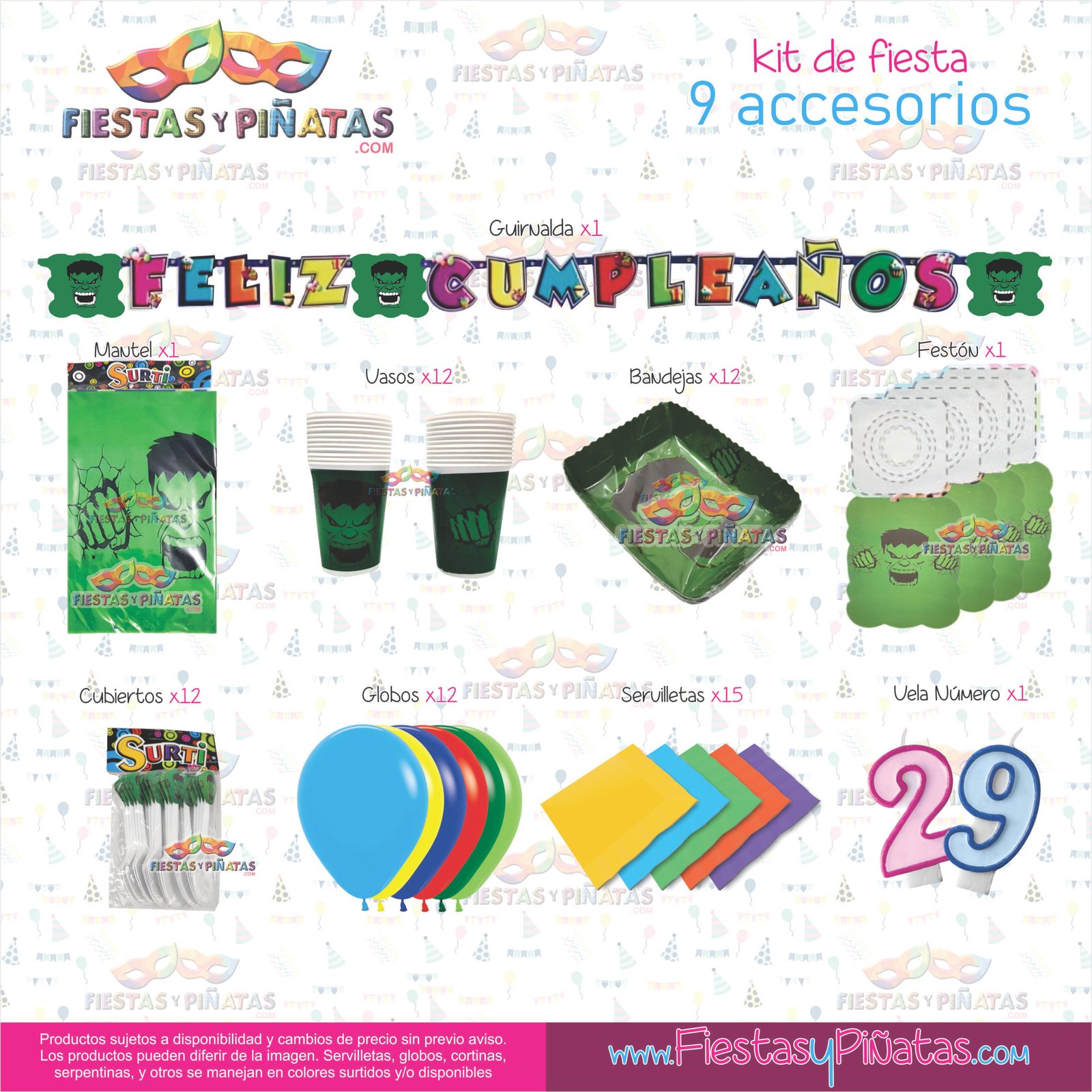 KIT CUMPLEAÑOS HULK– DECORACIÓN FIESTAS Y PIÑATAS – 9 ACCESORIOS