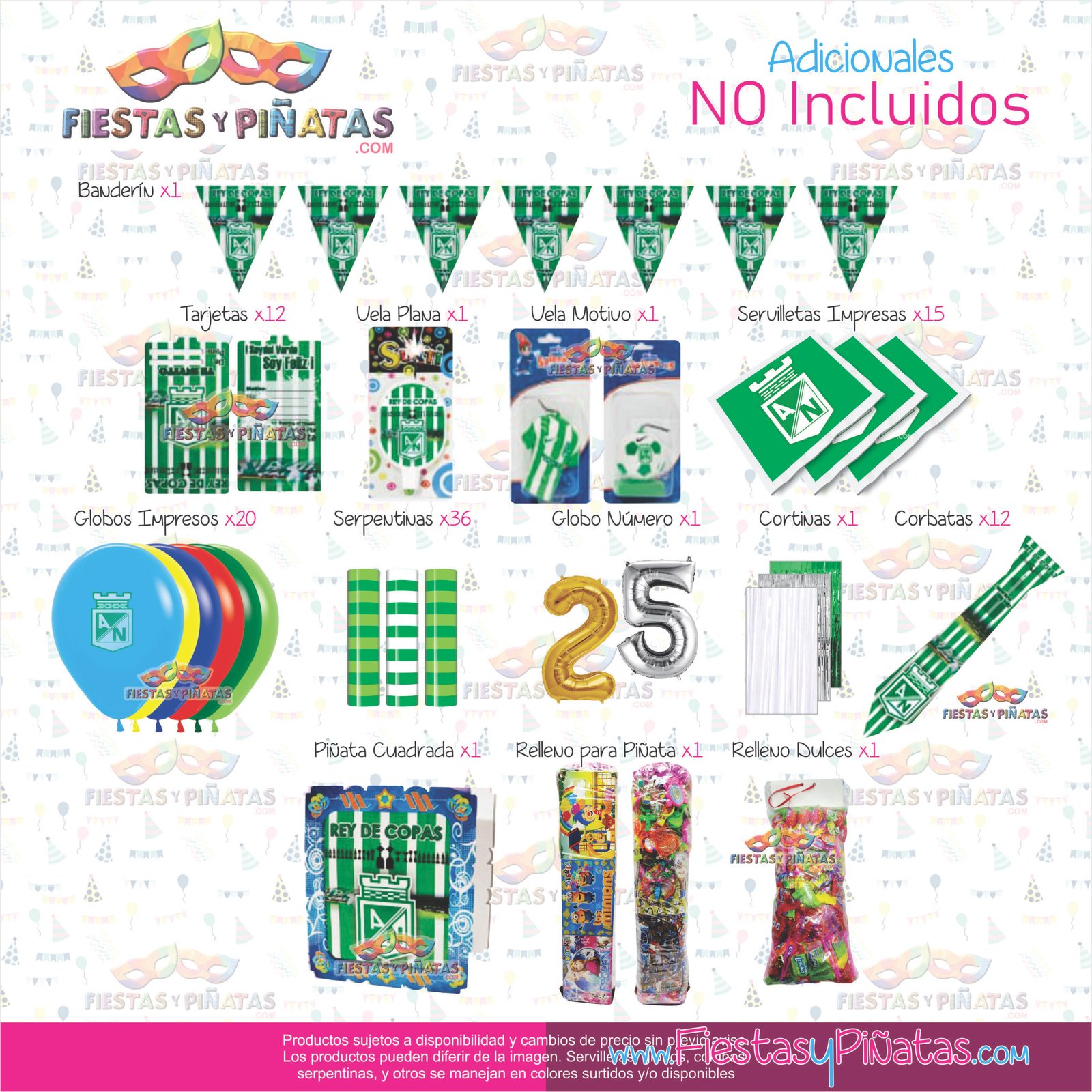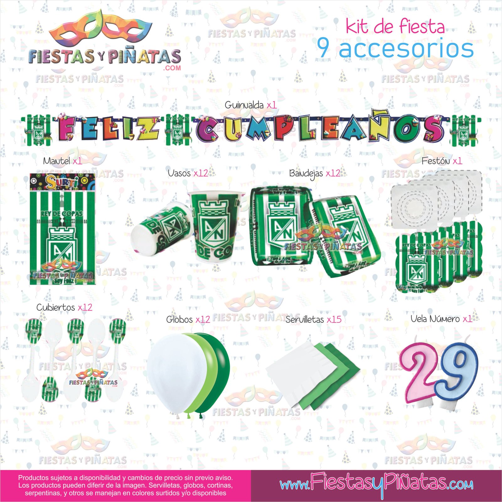 KIT DE CUMPLEAÑOS DECORACIÓN FUTBÓL ATLETICO NACIONAL PARA FIESTAS 9 ACCESORIOS